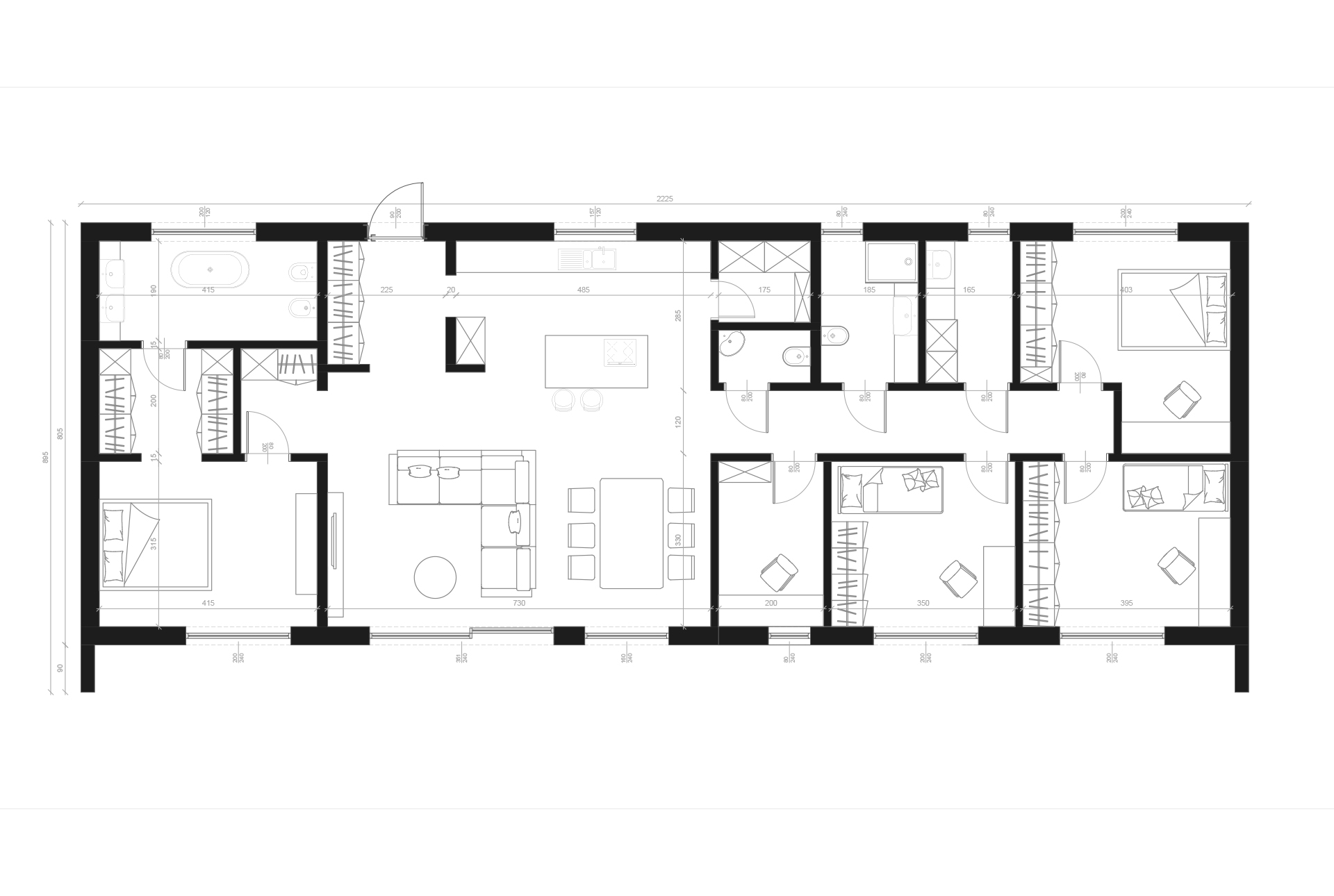 Ekskluzywny dom o powierzchni 148m2 z sześcioma sypialniami i trzema łazienkami. Główna sypialnia z garderobą i prywatną łazienką została usytuowana po przeciwnej stronie domu, co gwarantuje prywatnośc. Przestronny i funkcjonalny układ wnętrz spełni oczekiwania najbardziej wymagających.